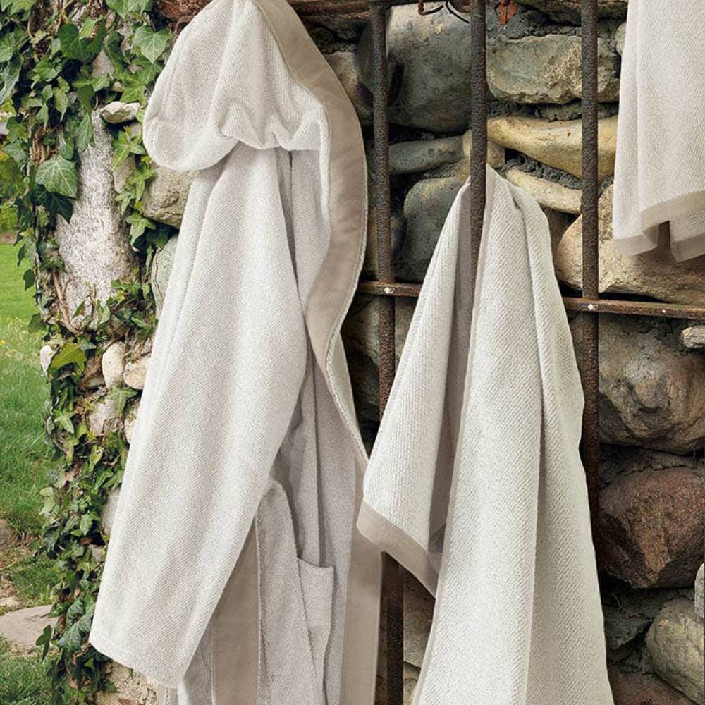 Un elegante tinta unita con bordo a contrasto con Perla, il nuovo accappatoio della Collezione Naturae di Gabel. Modello con cappuccio in jacquard tinto in filo di puro cotone idrofilo con bordo tinta unita a contrasto applicato su girocapo e cintura. Filato doppio ritorto con finissaggio Touch Soft & Dry pensato per un'ottimale morbidezza ed idrofilia, maggior volume e dimensioni irrestringibili. Grammatura: 460 g/mq.