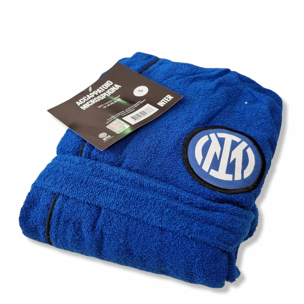 Accappatoio INTER per Adulti realizzato in 100% microspugna di cotone con ricamo dello stemma ufficiale della squadra all’altezza del petto.