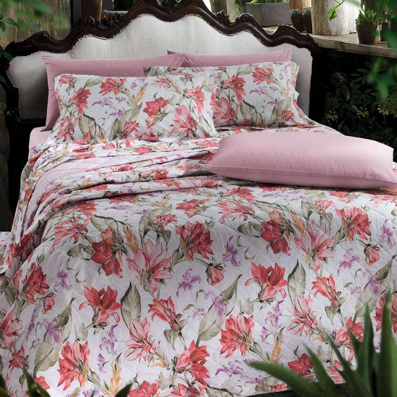 Il copriletto trapuntato Bella, dall'interpretazione floreale tra il classico e il moderno, è stampato su tessuto Sweet Touch, in saia jacquard da 58 fili al cmq. Tessuto sotto: madapolam di puro cotone da 58 fili al cmq con imbottitura in morbida fibra rigenerata anallergica di poliestere.