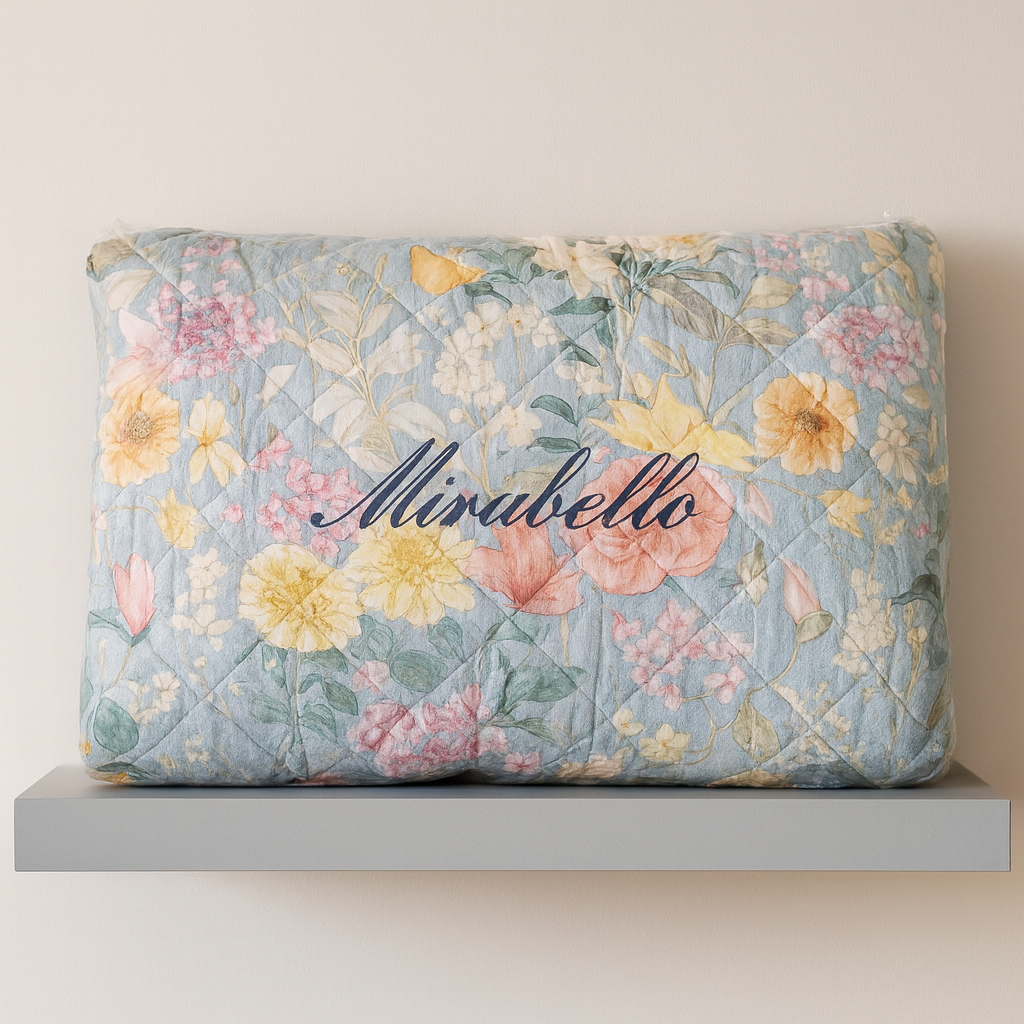 Raffinatissima fantasia floreale declinata su uno sfondo avio, per un copriletto che diventa complemento d'arredo. Elegante e raffinato in puro stile italiano, come solo Mirabello sa fare.