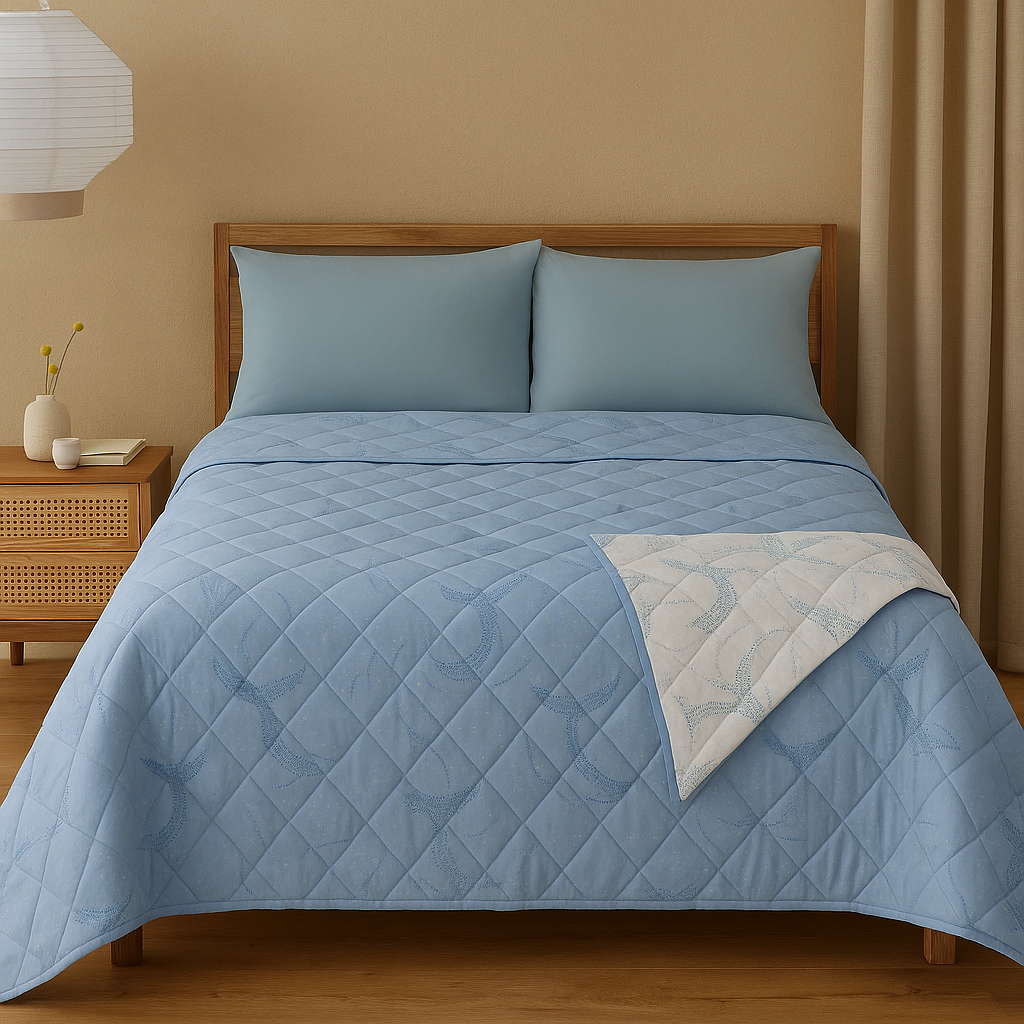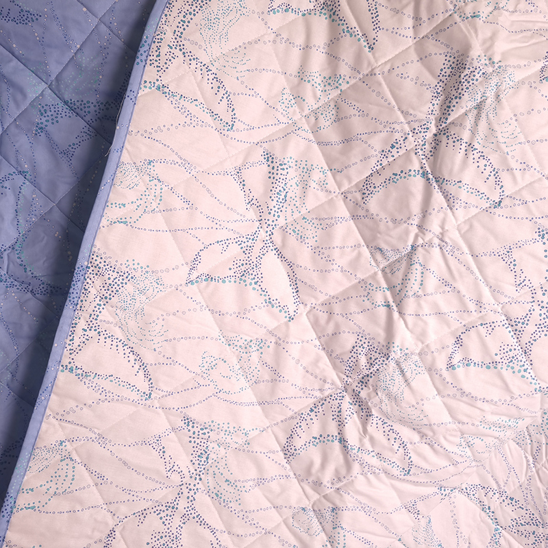Copriletto trapuntato con leggera imbottitura 100 grm2, ideale per le mezze stagioni. La freschezza della stampa estiva di bolle che si compongono formando delle code di balena sul fronte si coordina alla stampa in contrasto sul retro, per un insieme 100% cotone naturale in lucente raso.