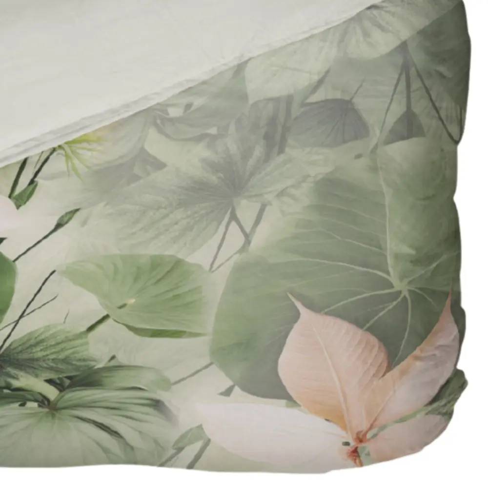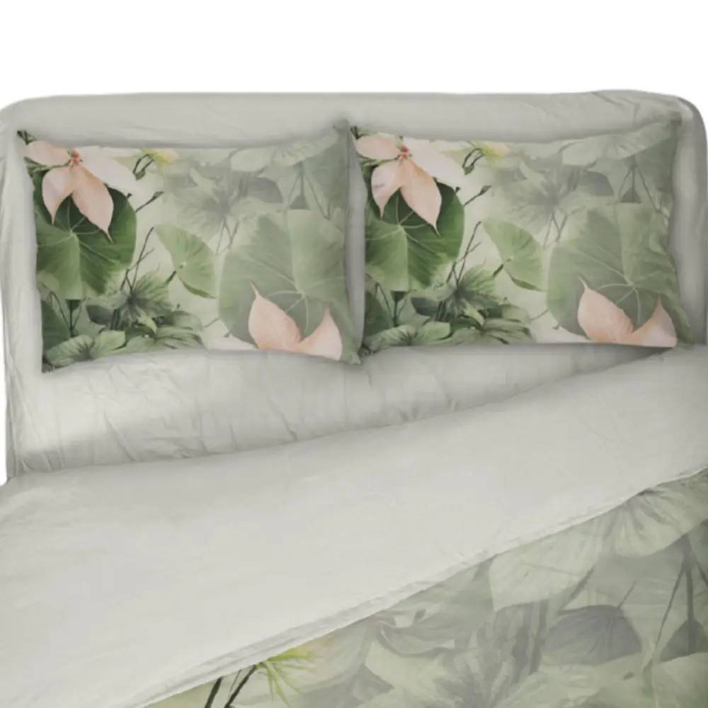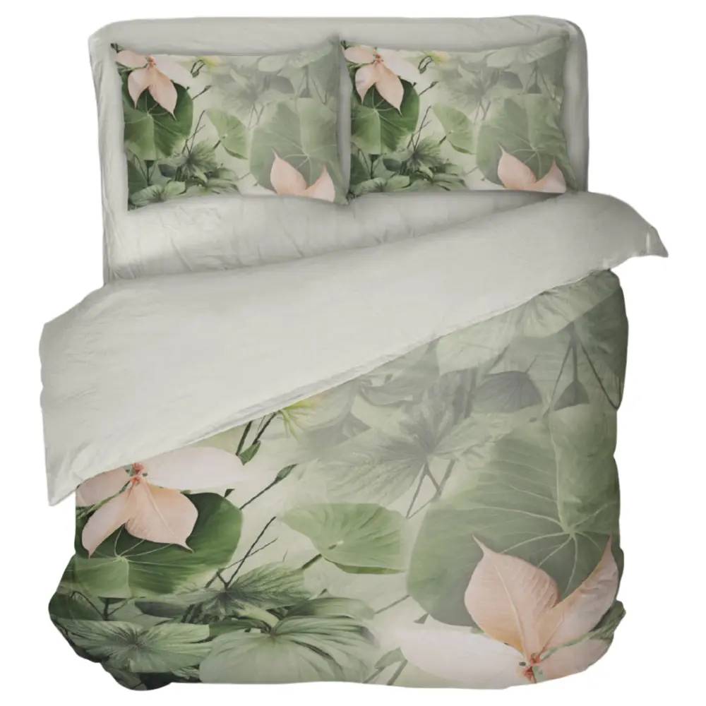 Parure copripiumino matrimoniale in raso di puro cotone KIRSI, in fantasia floreale effetto-acquerellato nei toni del verde stampato in digitale, adatto per camere da letto dall'arredamento classico e moderno.