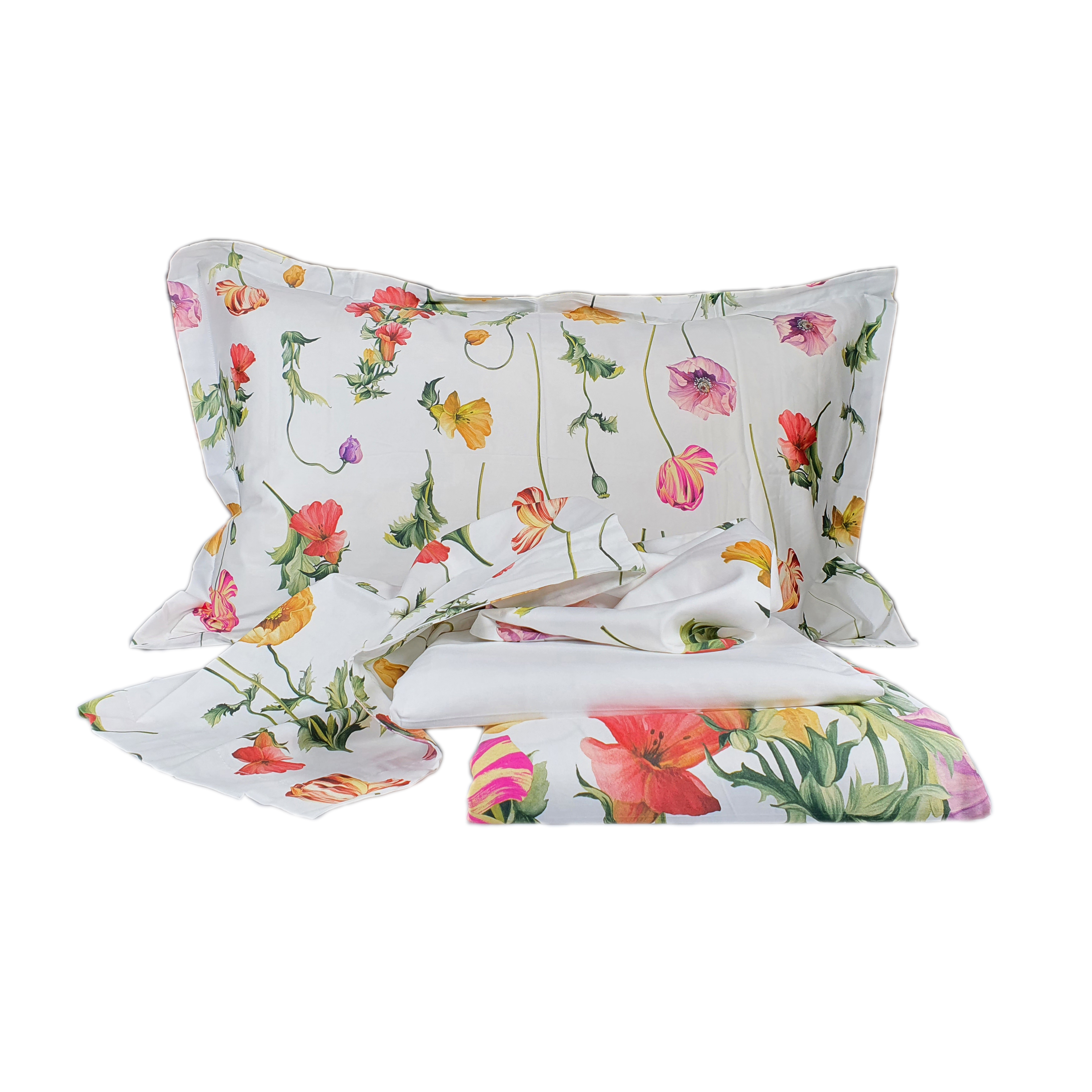 Meravigliosa e moderna fantasia floreale per un copripiumino che diventa complemento d'arredo con i suoi colorati papaveri. Elegante e raffinato in puro stile italiano, come solo Mirabello sa fare.