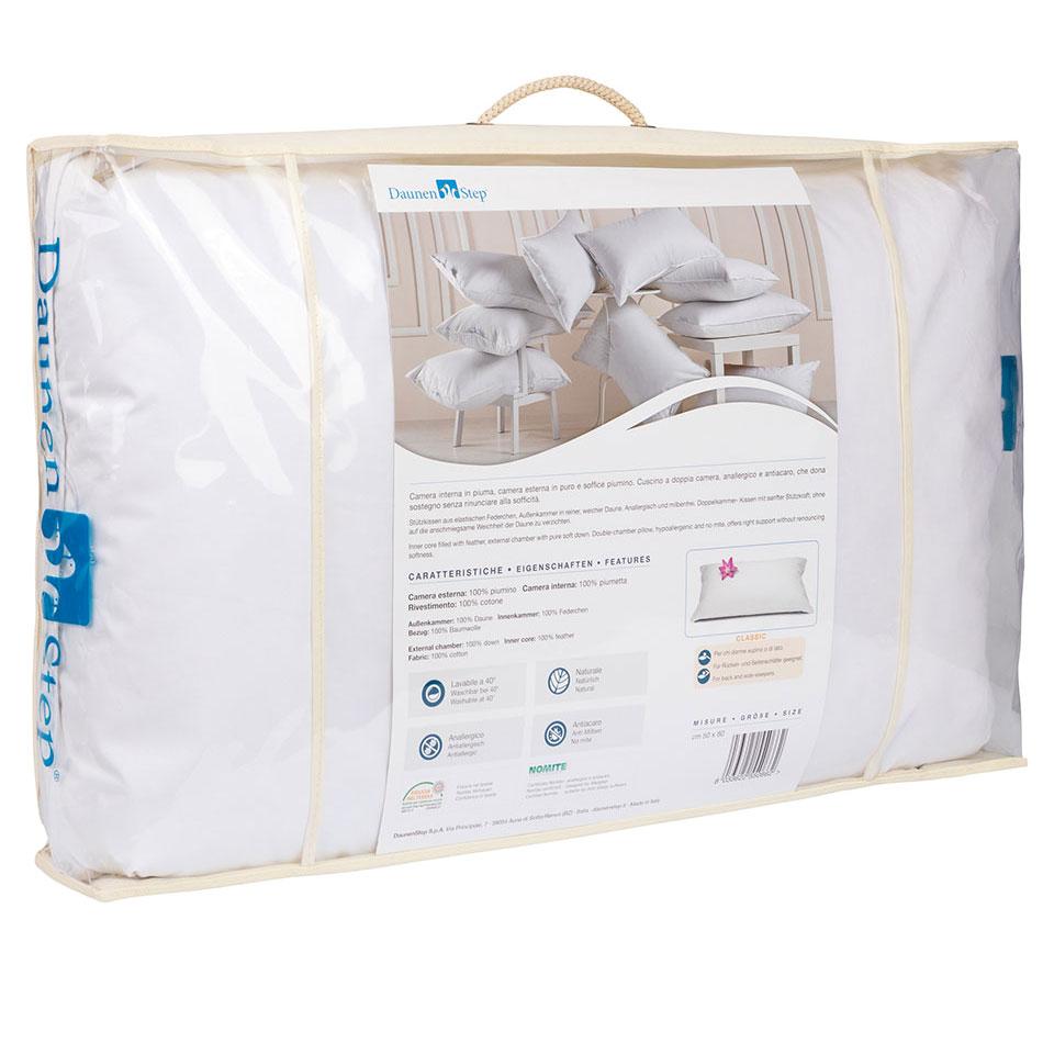 Il cuscino in piuma President è lavabile in lavatrice ed è disponibile nella misura standard Italia. Grazie alla sua conformazione a doppia camera, garantisce un sostegno adeguato e allo stesso tempo una sensazione di morbidezza sulla pelle del viso. La DaunenStep è un'azienda che da anni produce cuscini e piumini di alta qualità, garantendo un sonno ottimale per tutte le esigenze di postura.
