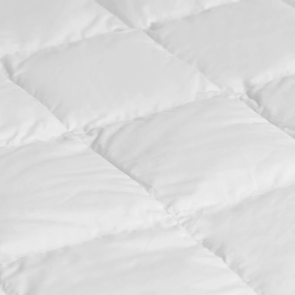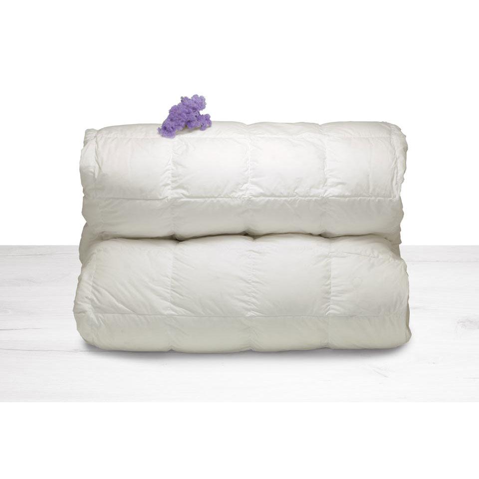 La trapuntatura a quadri fissi mantiene le piume stabili e distribuite in modo uniforme. Il bordo piatto con asole permette anche l’eventuale unione con un secondo piumino.