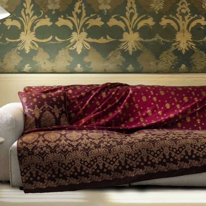 L'armoniosa palette di colori bordeaux e oro conferisce un'atmosfera calma ed elegante. Che sia adagiato su un divano o un letto, come tovaglia o come elemento decorativo su una panca, questo telo arredo crea accenti delicati ma d'effetto.