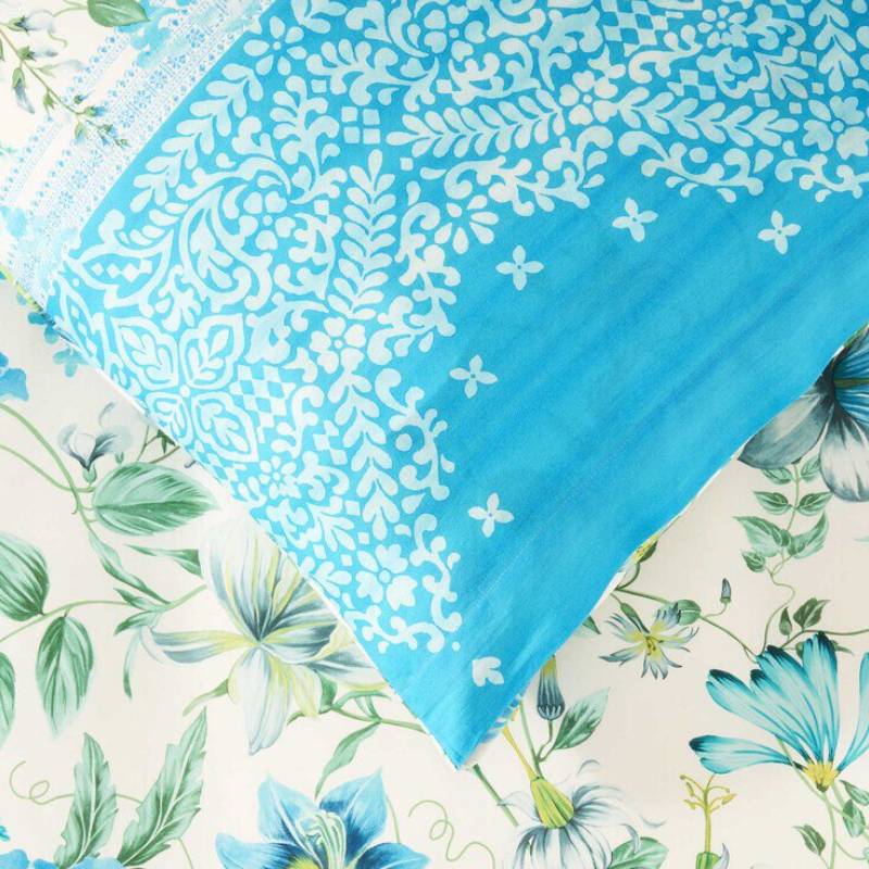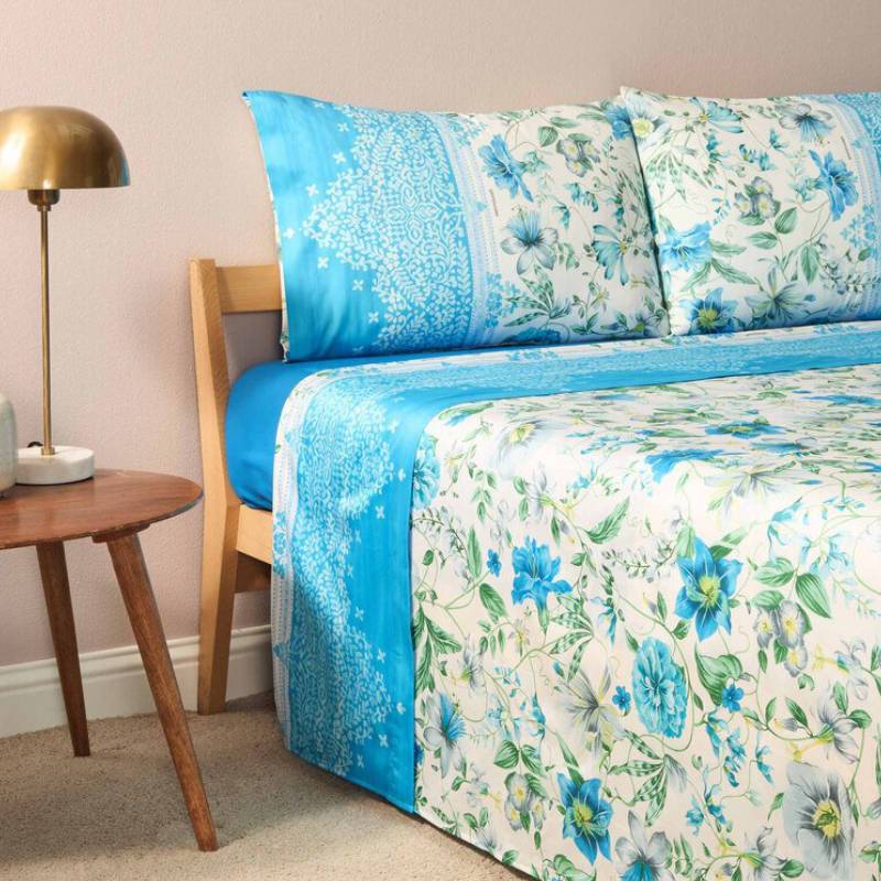 Il lenzuolo superiore misura 250x280 cm e può essere utilizzato anche come copriletto leggero grazie alla sua ampiezza e alla stampa piazzata ad alta definizione. La fantasia Casablanca unisce motivi floreali che mixano il disegno delle peonie, degli ibiscus e dei glicini in un affascinante erbario fiorito. Il lenzuolo inferiore è in tinta unita turchese e misura 175x200 cm con angoli alti 30 cm, perfetto per materassi standard e alti.