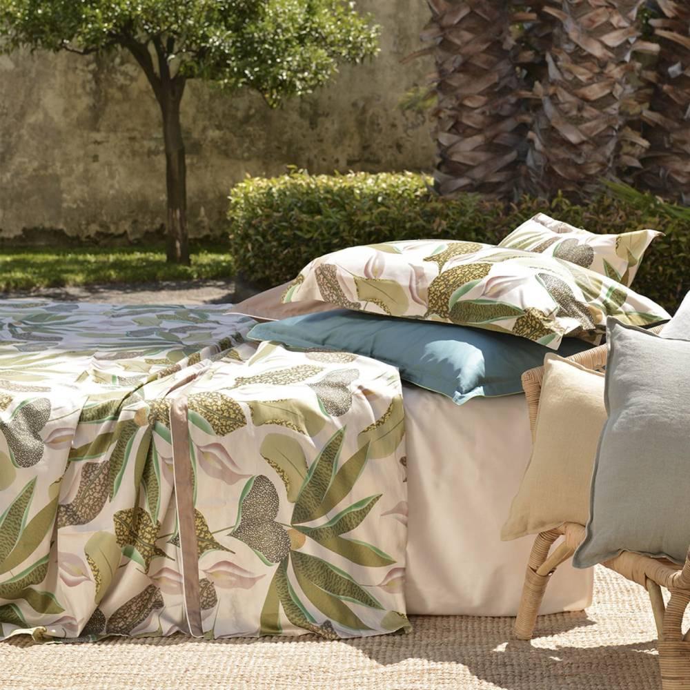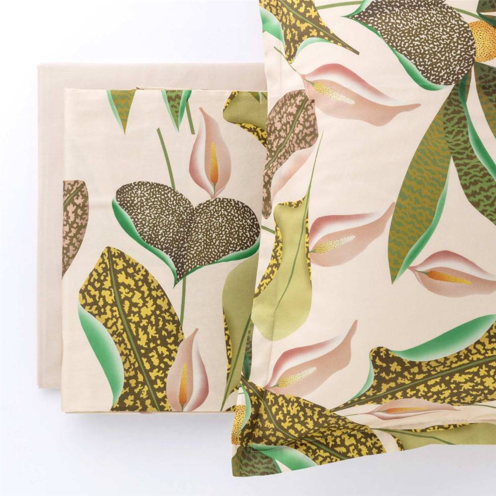 Il completo di lenzuola in raso CALYPSO è composto da lenzuolo di sopra, lenzuolo di sotto e 2 federe, realizzato al 100% in raso satin di cotone. Il lenzuolo ha una raffinata stampa digitale con motivo floreale sui toni del corda e del verde, mentre il lenzuolo di sotto è tinta unita.