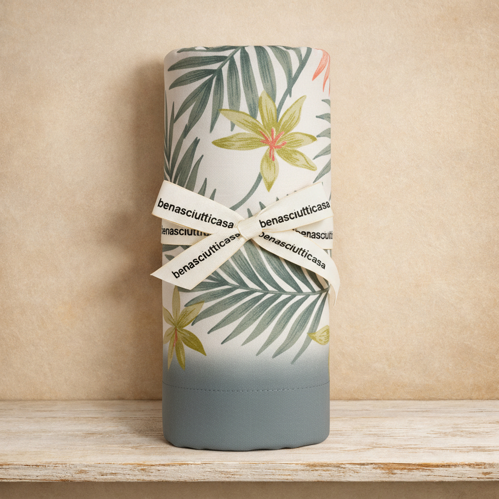 La stampa si distingue per il contrasto armonioso tra la delicatezza dei fiori esotici e l'eleganza dello sfondo avio. Ideale per chi cerca uno stile Urban-Jungle senza rinunciare alla classe.