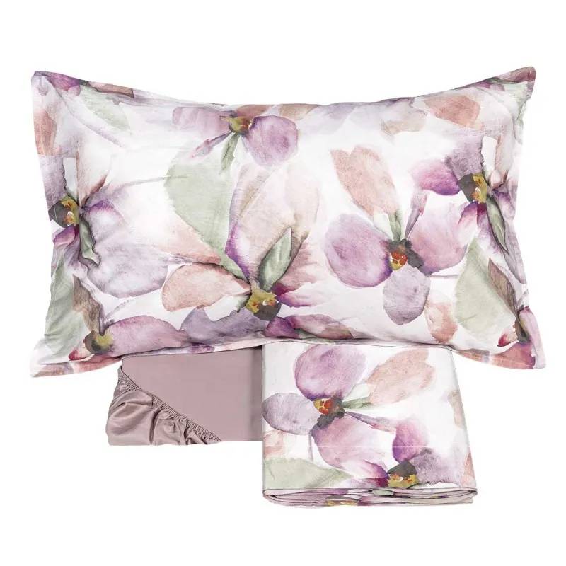 Le federe a quattro volanini ed il lenzuolo-copriletto sono in percalle di puro cotone stampato in digitale. Il resto del completo è in percalle di puro cotone tinta unita.