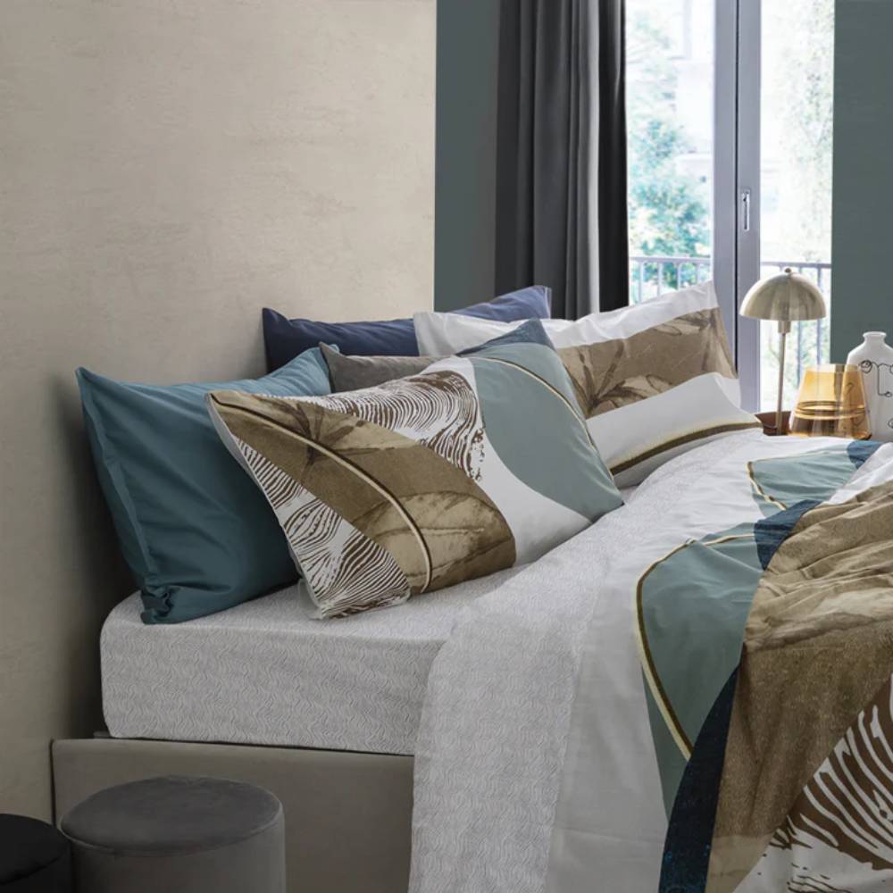 L'elegante fantasia astratta nei toni del verde e del marrone è stampata su puro cotone con colori brillanti e inalterabili nel tempo, per donare morbidezza e sognare a colori.