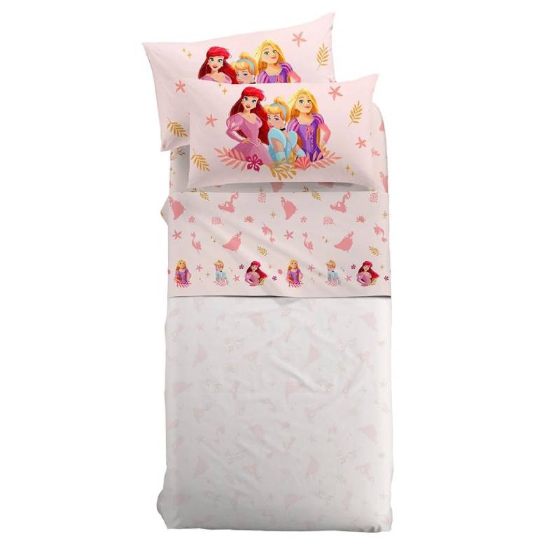 Le piccole fan delle favole delle Principesse impazziranno per questo completo di lenzuola con le protagoniste dei loro cartoni animati preferiti.