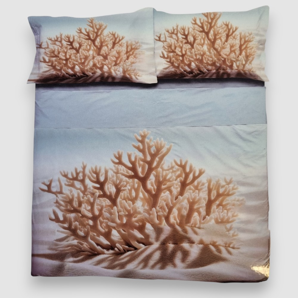 Lenzuola in fantasia marina con stampa di coralli nei tenui toni del rosa, che creano un'atmosfera unica nella tua camera da letto.