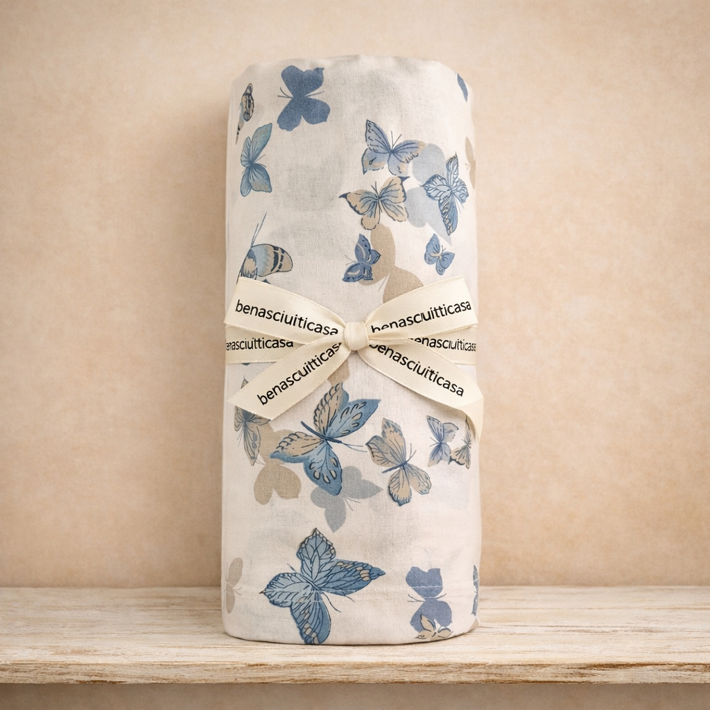 La tonalità azzurro-bluette è la scelta ideale per chi vuole osare con il colore senza rinunciare all'eleganza. A differenza dei classici toni caldi, questa tonalità crea un ambiente intimo e fresco. La fantasia con le farfalle aggiunge quel tocco di evasione necessario per trasformare la stanza in un rifugio di puro relax. È un completo versatile, perfetto per chi ama viaggiare con la mente restando nel comfort di casa propria.