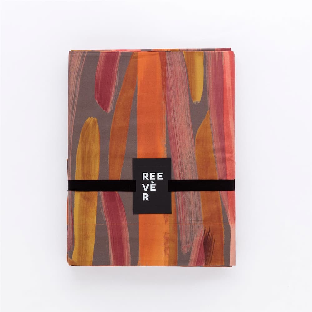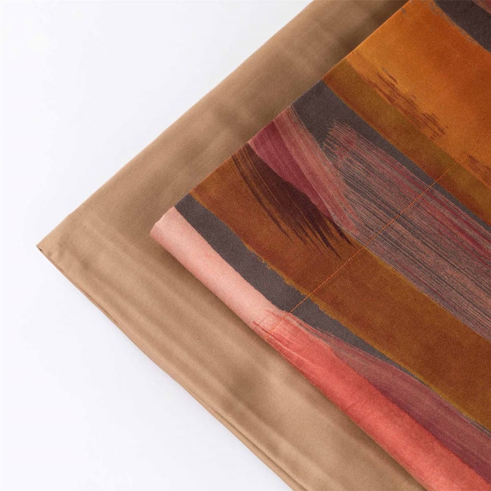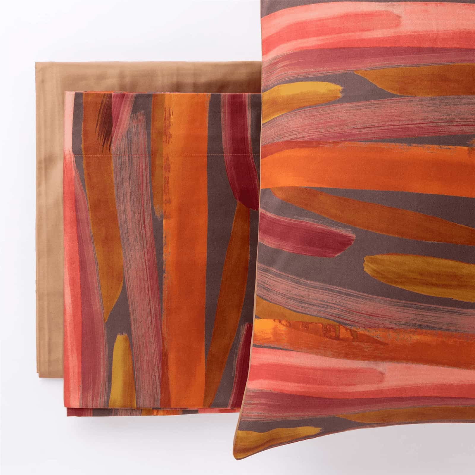 Completo lenzuola in raso di puro cotone con fantasia a pennellate di colore sui toni caldi e lenzuolo di sotto in tinta unita coordinata. Morbide e lisce queste lenzuola sono perfette da abbinare alle trapunte in coordinato.