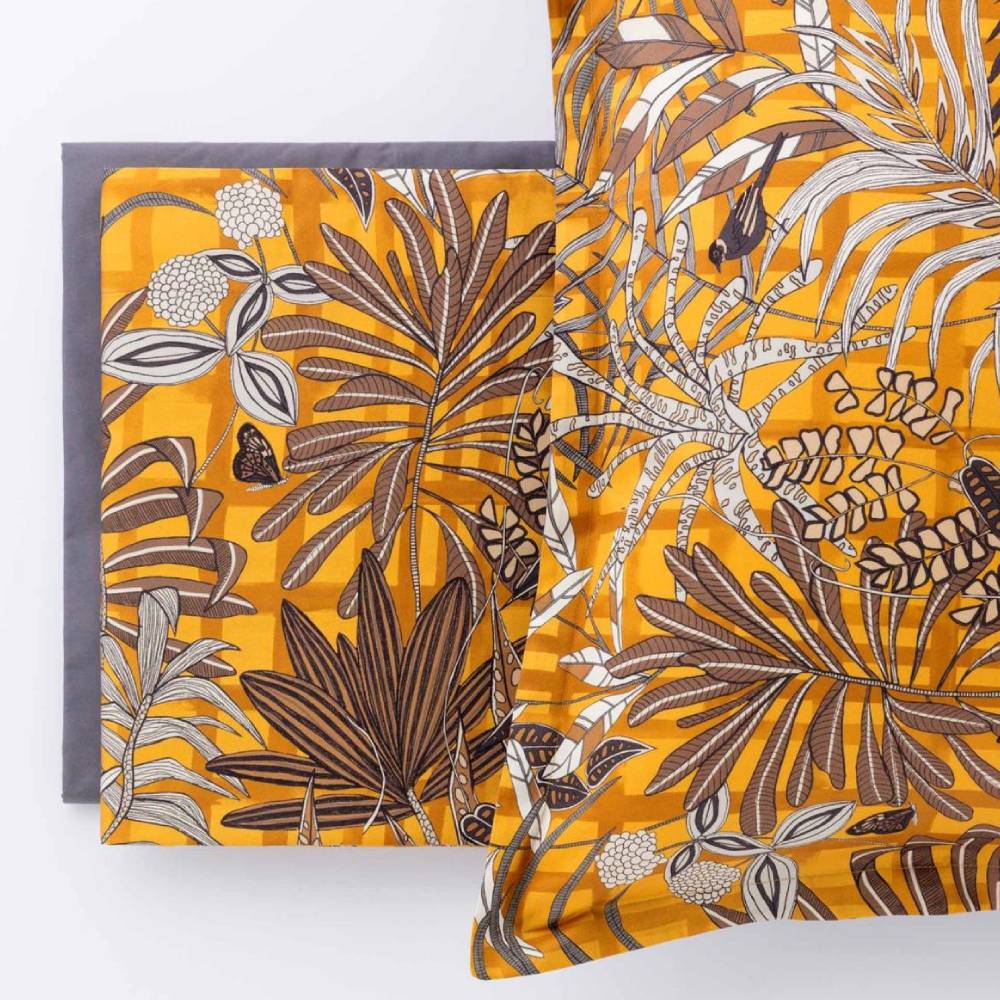 Completo lenzuola in raso di puro cotone con fantasia foliage su fondo marrone e lenzuolo di sotto in tinta unita coordinata. Morbide e lisce queste lenzuola sono perfette da abbinare alle trapunte in coordinato.