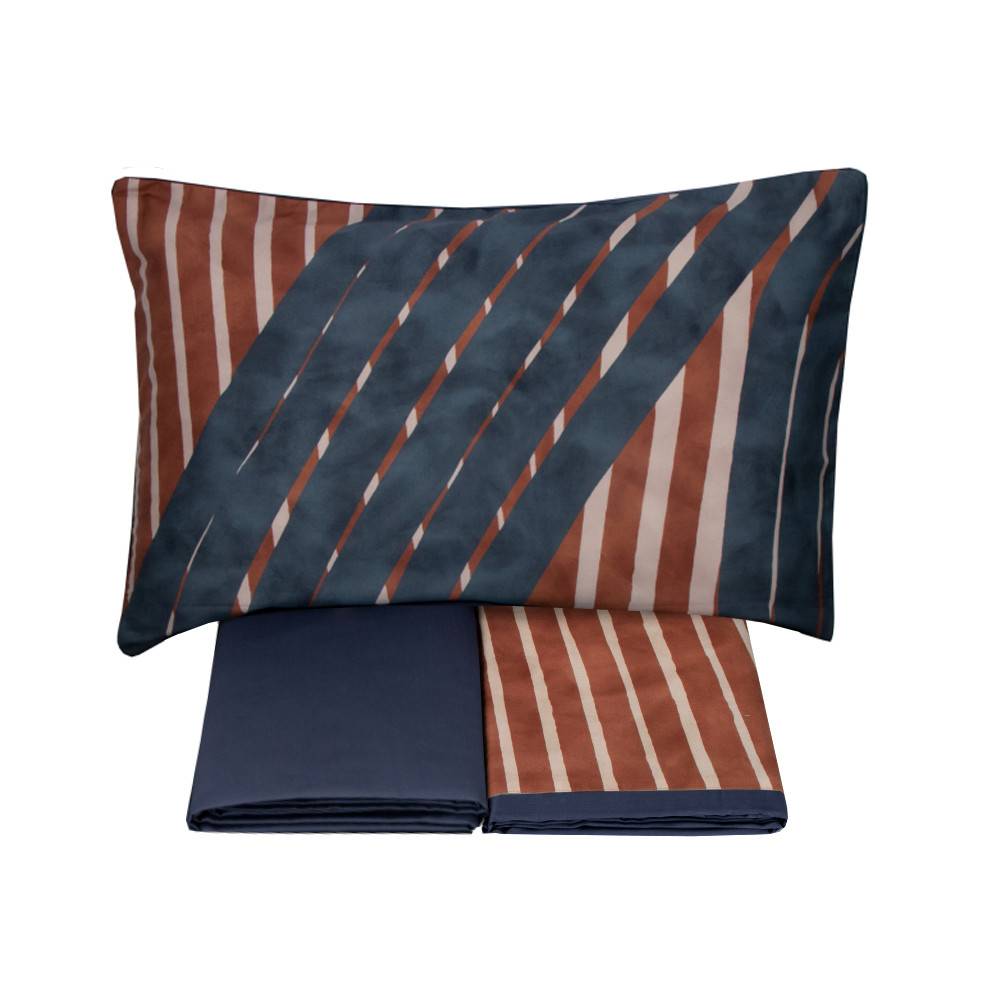 Una trama inedita e intramontabile con Icaro, il completo letto matrimoniale di Somma 1867, realizzato su raso di puro cotone 120 fili cm/q con stampa digitale. Composto da lenzuolo con balza applicata, rifinito con piping, coppia di federe, sopra stampa piazzata e retro tinta unita, anch'esse rifinite con piping perimetrale e sottolenzuolo tinta unita con angoli.