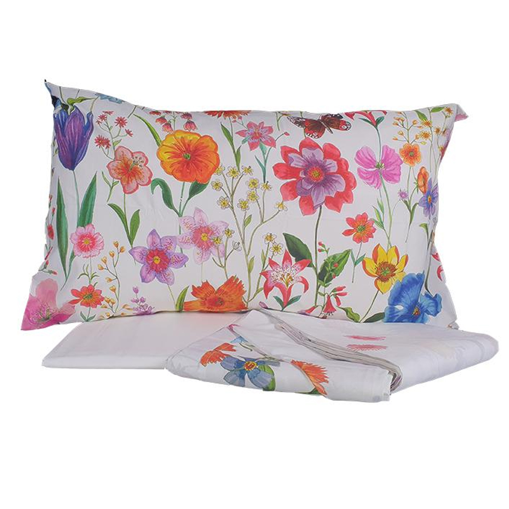 Il lenzuolo sopra è stampato con balza staccata a 60 cm e riattaccata a rovescio. Lenzuolo sotto tinta unita coordinato.