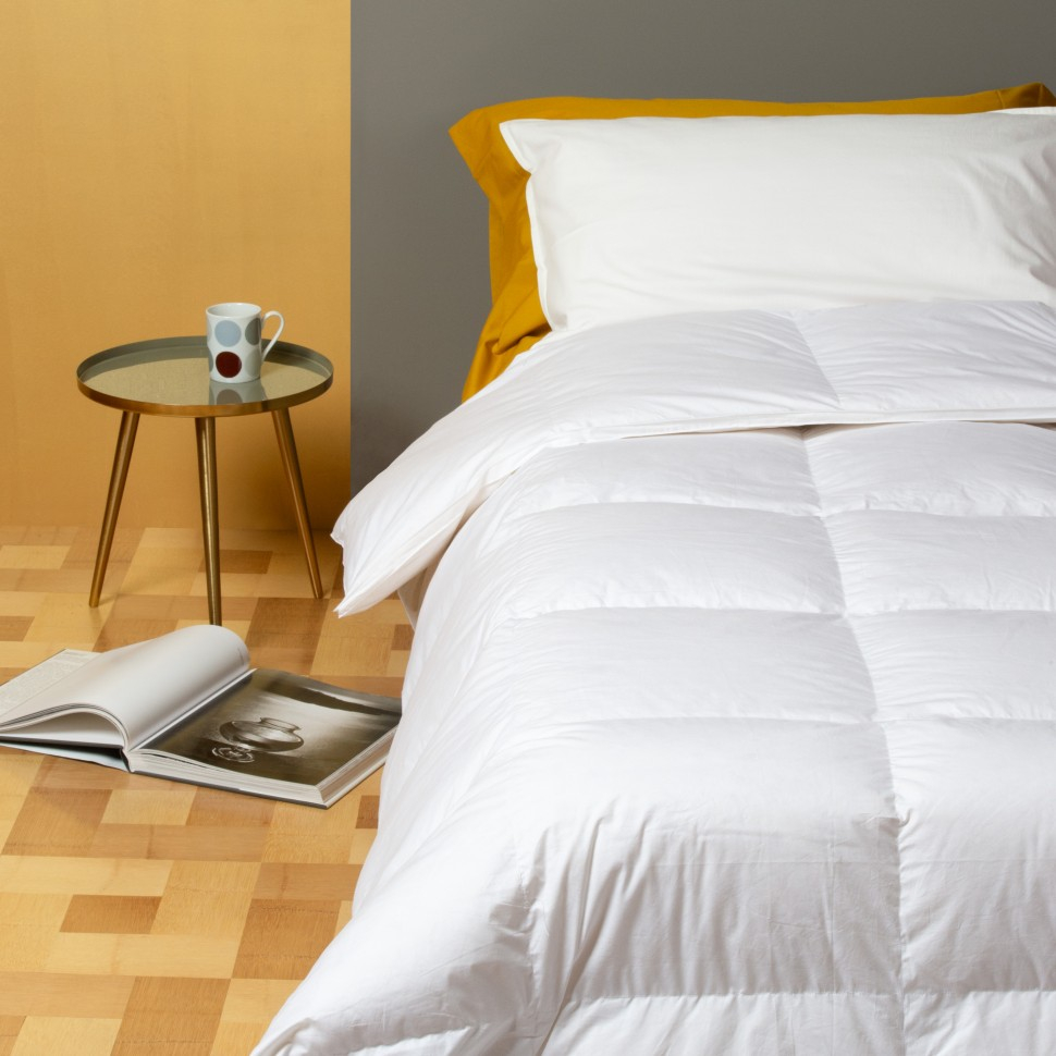 Misura: 155x200 cm | Tessuto: Cotone Cambric Oeko-Tex | Imbottitura: 100% Piumino d’Oca Ungherese | Punti Calore: 4