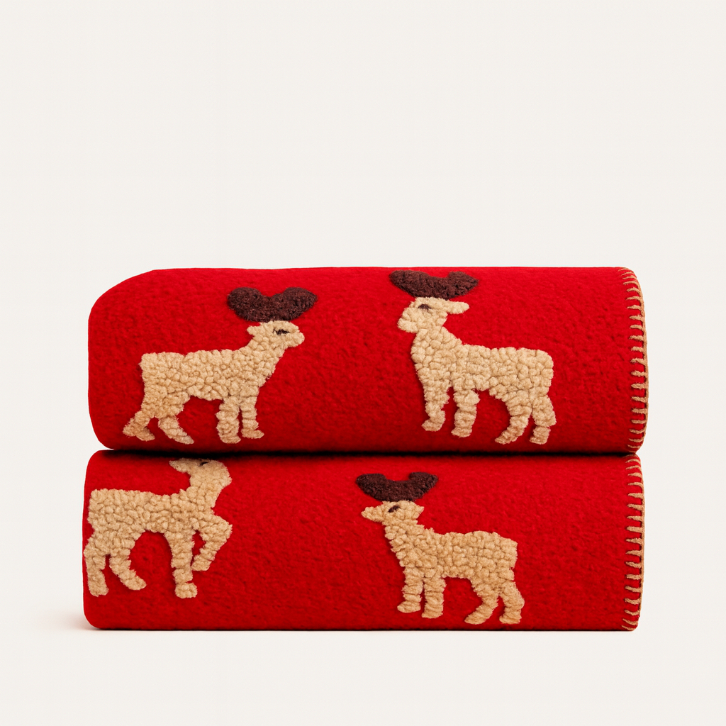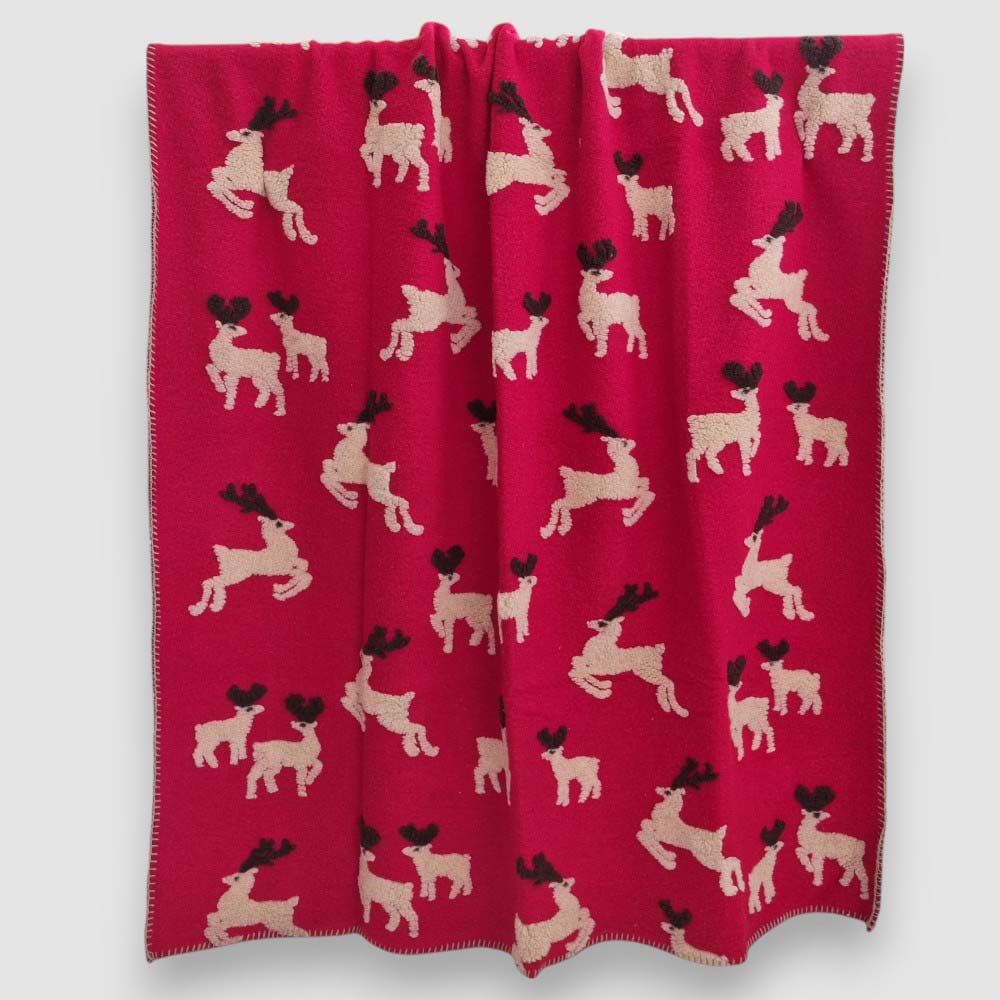 Scopri il plaid in lana cotta con motivo di cervi su fondo rosso. Morbido e caldo, misura 150 x 170 cm, perfetto per aggiungere comfort e stile al tuo salotto o camera.