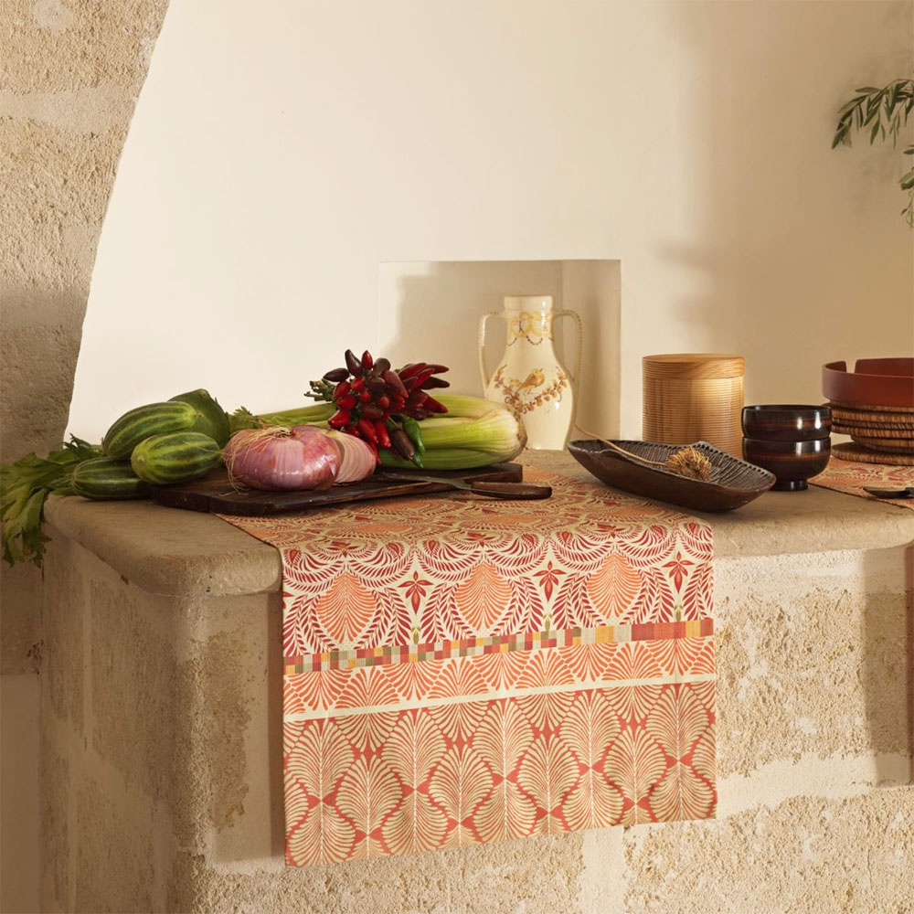 Tutta la qualità di Granfoulard Bassetti a tavola. Il runner NAIROBI in fantasia etnica nelle nuances del rosso mattone e dell'avorio, è disponibile in panama di puro cotone, con trattamento esclusivo per una piacevole mano.