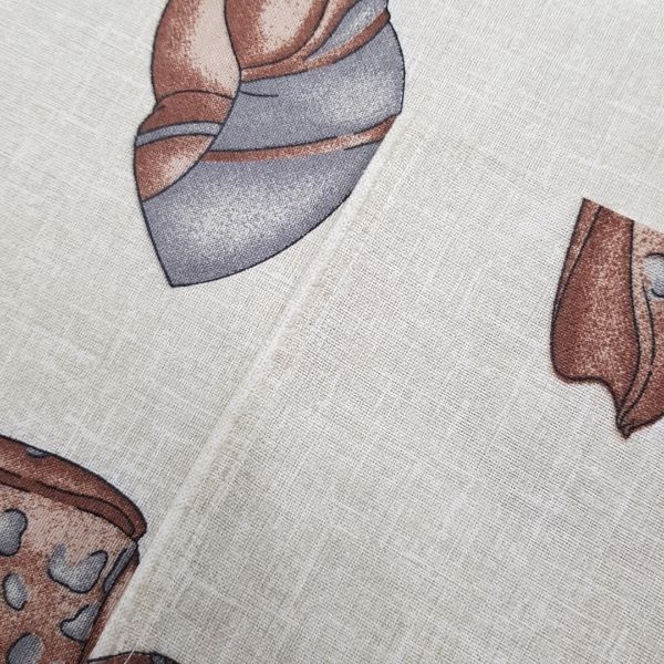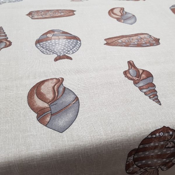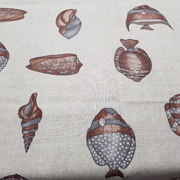 Tovaglia in panama di cotone con fantasia estiva di pesci e conchiglie nei toni del marrone su fondo sabbia, perfetta per una tavola di tutti i giorni.