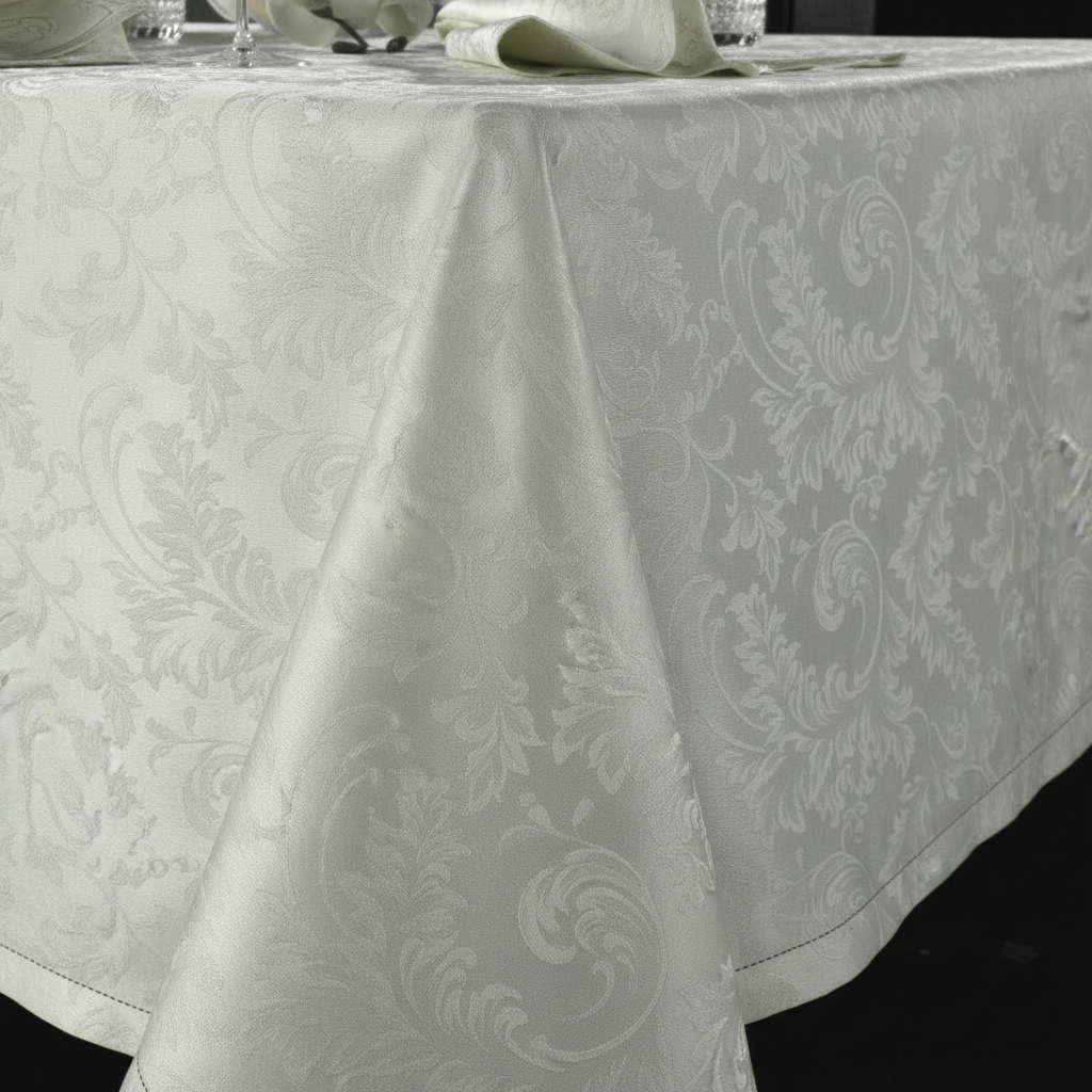 Servizio da tavola PIAZZA PITTI per 8 persone in fiandra con lavorazione damascata jacquard e rifinito con orlo a giorno.