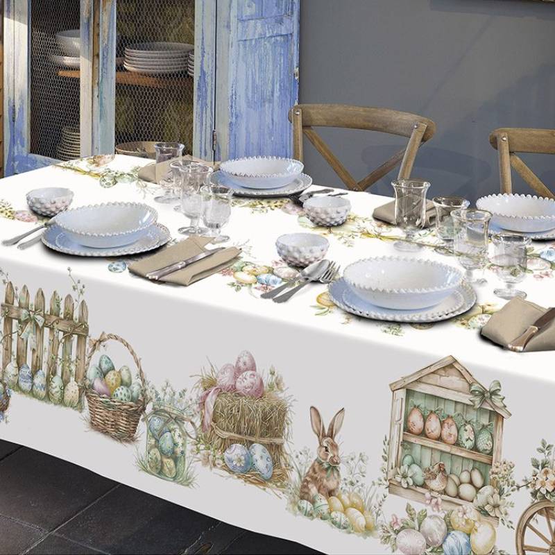 La tovaglia di PASQUA BUNNY di Tessitura Randi è perfetta per arricchire la tua tavola durante le festività. Realizzata in morbido panama di cotone, questa tovaglia è decorata con un'originale fantasia di uova e coniglietti, raffigurati in una stampa digitale ad alta definizione che esalta ogni dettaglio. Il design elegante e festoso crea un’atmosfera accogliente, ideale per rendere speciali i pranzi e le cene del periodo Pasquale.