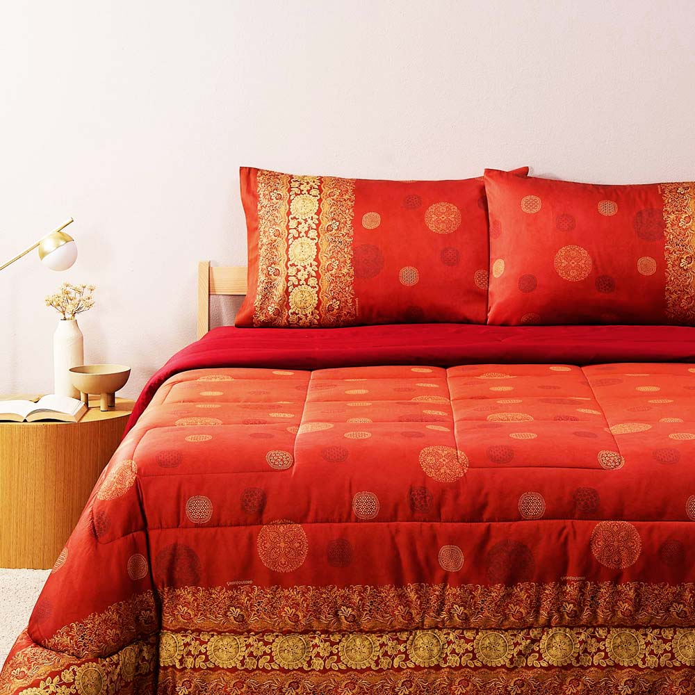 Trapunta matrimoniale Bassetti Pallavicino R1 in raso di puro cotone con elegante stampa in toni caldi del rosso. Imbottitura in poliestere da 320 g/m², ideale per affrontare le fredde notti invernali. Prodotto interamente negli stabilimenti di Bassetti in Italia.