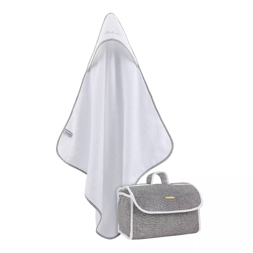 Triangolo in spugna 100% cotone profilato con sbieco di percalle stampato con iconico motivo “OP” Occhio di Pernice e logo Borbonese ricamato sul cappuccio. Il triangolo è inserito in un pratico beauty realizzato in percalle stampato imbottito con interno impermeabile, chiusura in velcro ed impreziosito da targhetta in metallo con logo Borbonese.
